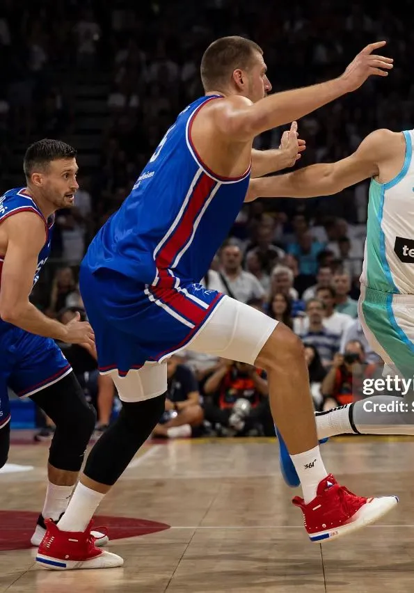 塞尔维亚队尼古拉-约基奇在这两场比赛中均穿着国家队配色361° Joker1 PE。